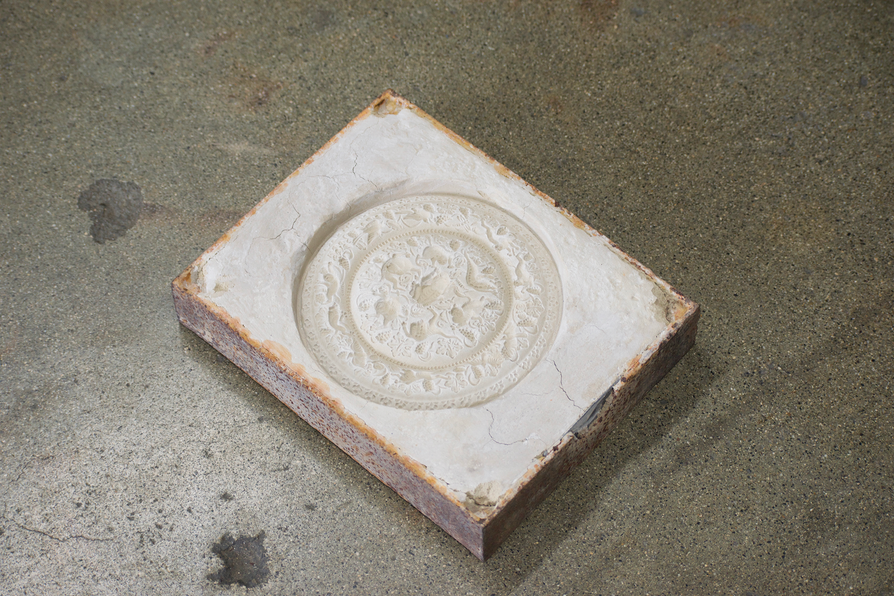 砂と粘土で鋳型 [1] を作るんですよ。粘土を削るっていうかね、へこましていくっていう感じで鋳型を作る。どうしても砂と粘土なので、潰れちゃうんでね。それをしないようにゆっくりゆっくりやっていかないとダメなんですよ。鋳型を作ったら、その中に錫と銅を溶かして流し込む。それを研いだら光るっていうか。まず削って、研いで、磨いて、最後光らす。表面にニッケルでコーティングしてあるんです。オリジナルで一から型を作ろうと思ったら1ヶ月から2ヶ月くらい。模様がない型から、こういう模様をつけていく作業をやっていきますね。