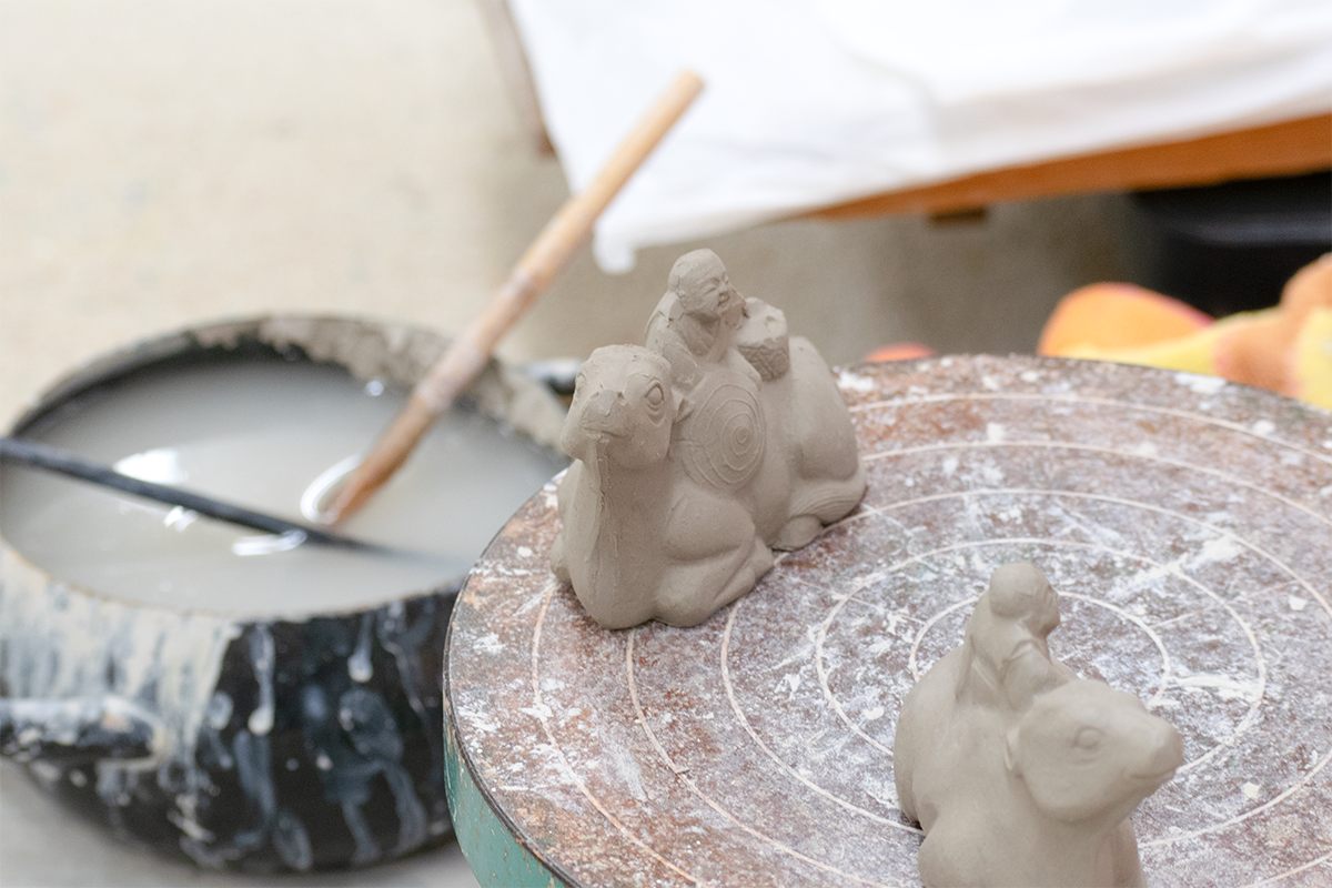 昔の人は芸術的な感覚も知識もすごいあったので、やっぱり人形の造形がもうすごいな、と思う。同じものを作れ、って今言われても僕はもう絶対無理やし。この辺りに5、60件あった窯元にも、僕らみたいな職人もいれば、原型だけ作っていろんなところに売ってる人とか、窯焚いて回った窯炊き職人みたいな人もいたらしいんで。昔はちょっと分業制がもっと今より敷かれてたみたいで。うちにある人形でも、門外不出の人形というわけじゃなくて、他のところから流れてきた型で作ったものとかもあるし、そもそも、いろんな人が原型作ってるやろうから、筆のタッチがちょっと違うんですよね。