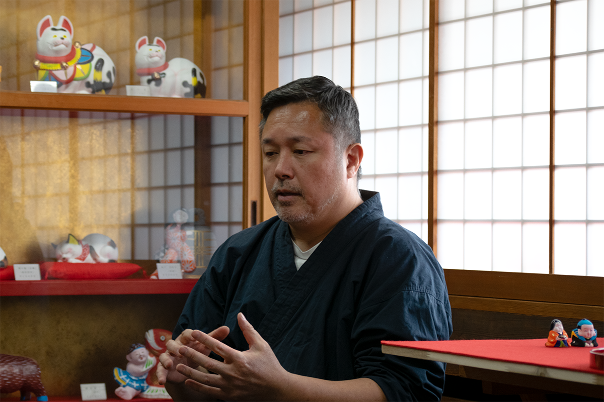 今は新作をあんまり作ってないんですよ。99%、昔からの型を使って作ってますね。うちの父でも作ったことない人形みたいなのがまだまだあるんで。元は昔の江戸時代とか明治の頃の型を使ってやってるんで。(工房の)裏に型がいっぱいあって、数えてないんで僕も分かんないですけど、ちっちゃいのまで合わせたら2000種類ぐらいあるっていう風に聞いてますね。